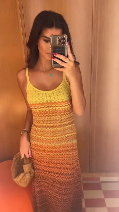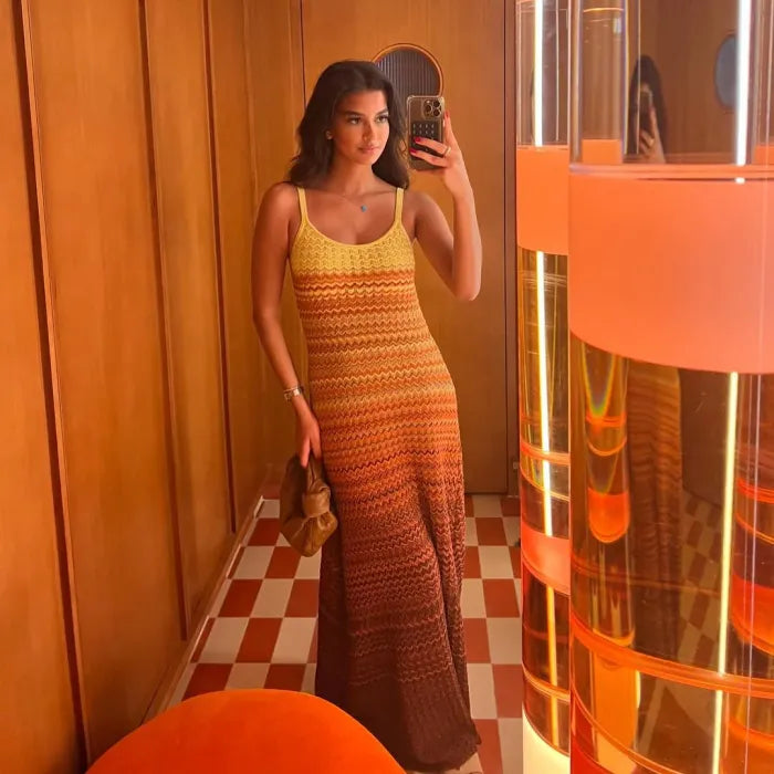 The Tristana Maxi Dress is a radiant ode to summer evenings. With its smooth ombré gradient from sunshine yellow to deep sienna, this knit dress evokes the warmth of golden hour. The body-hugging silhouette with subtle stretch skims your figure perfectly, while thin straps and a scoop neckline keep the look fresh and minimal.